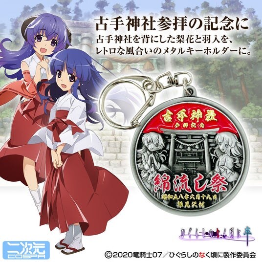 『ひぐらしのなく頃に 卒』より、古手神社を背にした梨花と羽入、懐かしい風合いの「古手神社 綿流し祭 お土産キーホルダー」が二次元コスパから新登場。