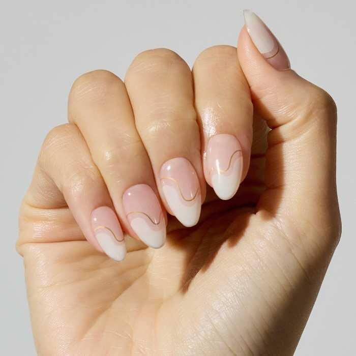 水面のような曲線が美しいウェーブフレンチ。ゴールドラインが洗練されたアクセントを添え、指先を華やかに。