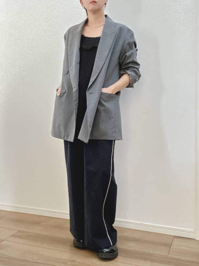 レースの繊細さがジャケットの構築的なラインに抜け感を与え、堅くなりすぎない“大人のモード感”を演出。ボトムスは、サイドライン入りのイージーパンツやワイドデニムなど、あえてスポーティ要素を合わせるのが今年流です。甘辛のバランスが絶妙で、オンにもオフにもマッチする万能スタイルに仕上がります。