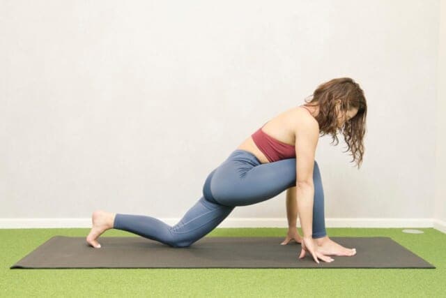 (1)床に四つん這いの姿勢になって、右脚を大きく前に踏み込む
