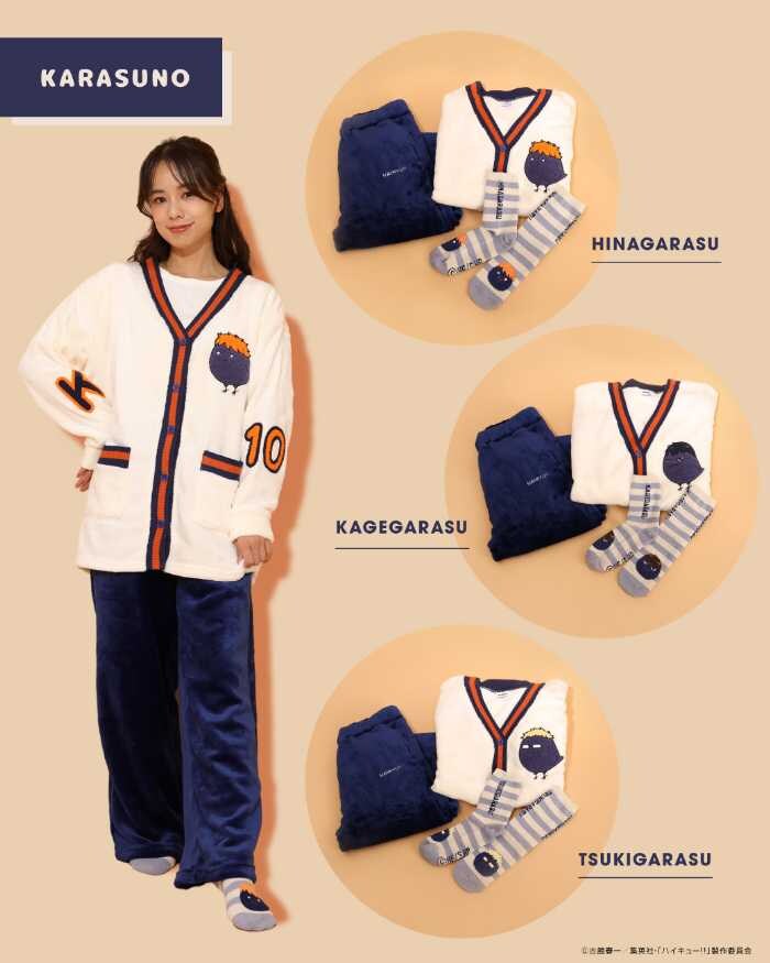 「ハイキュー!!もこもこルームウェア」(全7種)は、アニマルマスコットのサガラ刺繍がキュートなカーディガン&ボトムセット。