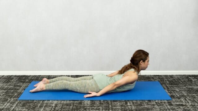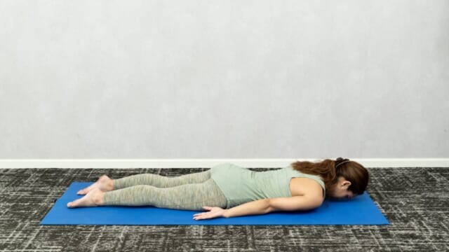 (1)うつ伏せになって両腕を体側に置き、おでこを床につける