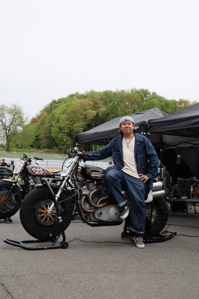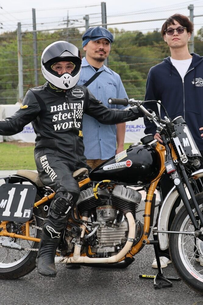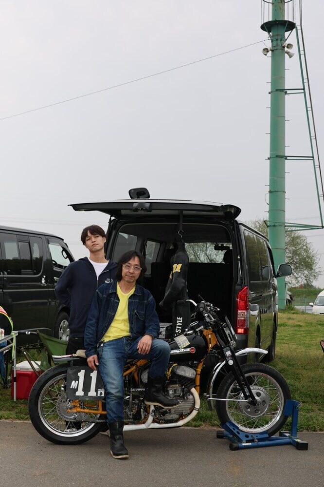 群馬県前橋市でジーンズショップ「NEAT STYLE」を営む角田さん。旧い物へのリスペクトを込めてレースにチャレンジするため、1942年式サイドバルブを手に入れたそう。私服は自社でオリジナル製作したデニム「極みWW2モデル」で、愛車の年代と雰囲気を合わせた。「とにかく黒×黄が好き(笑)」だそうで、ブラックレザーと黄色のTシャツを組み合わせている。