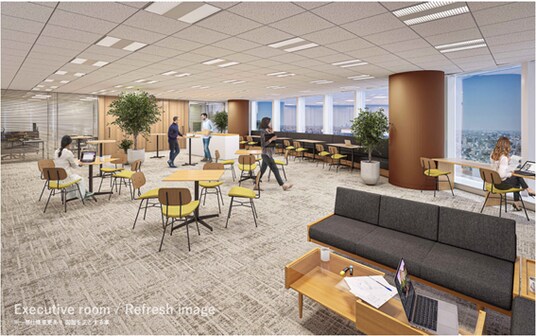 また、 従来は従業員の休憩スペースとしていたリフレッシュエリアは、十分にスペースを確保しつつも、外部イベント・勉強会・社内交流も可能なオープンスペースへと変更しました。