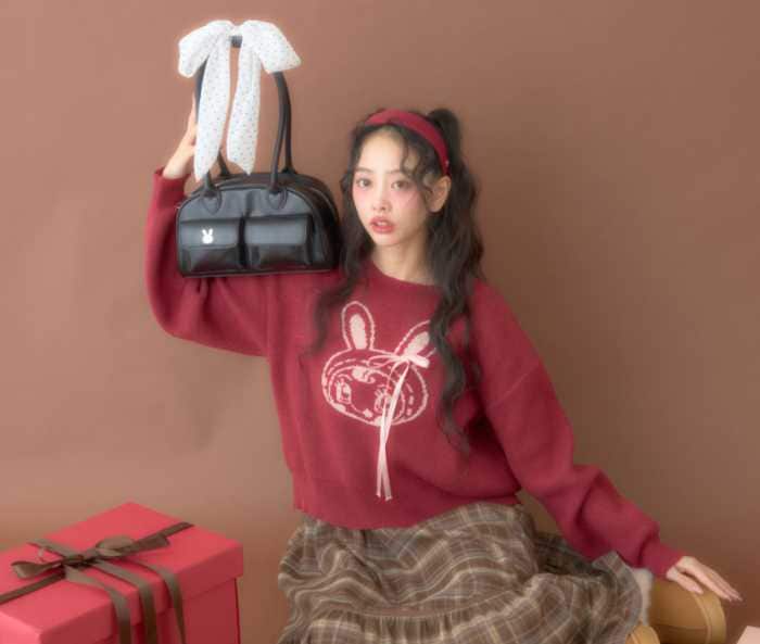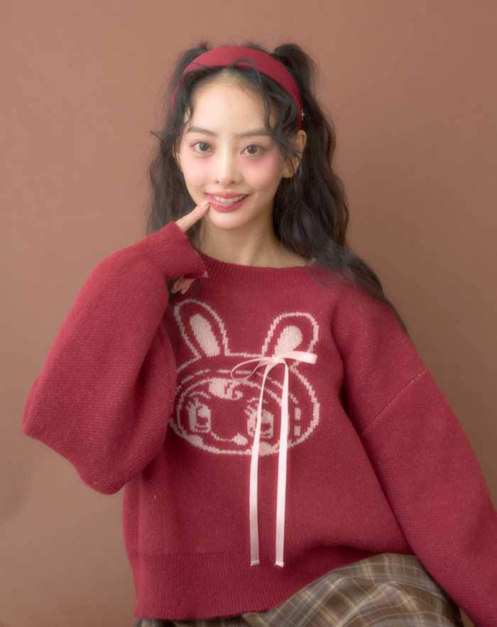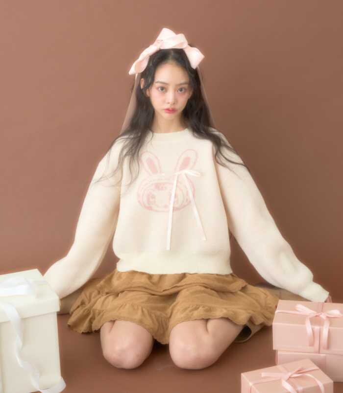 【ジャガードニット(税込¥7,689)】は、大きなべリエちゃんとリボンが印象的で、柔らかな肌触りとゆったりシルエットが特徴。