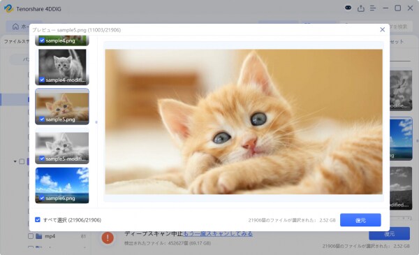 プレビュー機能: 復元前にファイルをプレビューできるため、必要なデータだけを選んで復元でき、効率的です。