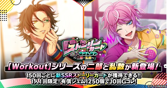 新ストーリーカード「SSR【Workout】山田二郎」と「SSR【Workout】飴村乱数」を獲得することができるGコレクトを開催しています。Gコレクトはジェムのほか、専用チケット「ストーリーGコレチケット(vol.2)」各種を使うことでも回すことができ、ビンゴミッションとログインボーナスで最大150回分のチケットを獲得できます。