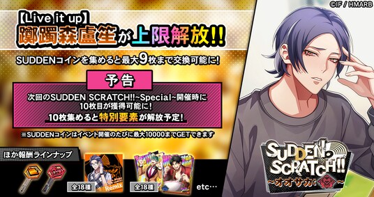 イベント期間中、KILLER SCRATCH!!をプレイするとライズ消費量に応じた確率でSUDDEN SCRATCH!!が発生します。SUDDEN SCRATCH!!をプレイすると、通常の報酬アイテムの他、限定アイテム「SUDDENコイン」を獲得することができます。「SUDDENコイン」を集めることで、「A.R.B remix」楽曲やレイズキー、ヨコハマ・ディビジョンのデコステッカーに使えるブースターなどと交換することが可能です。また、ストーリーカード「SSR【Live it up】躑躅森盧笙」が上限解放され、最大9枚まで獲得できます。