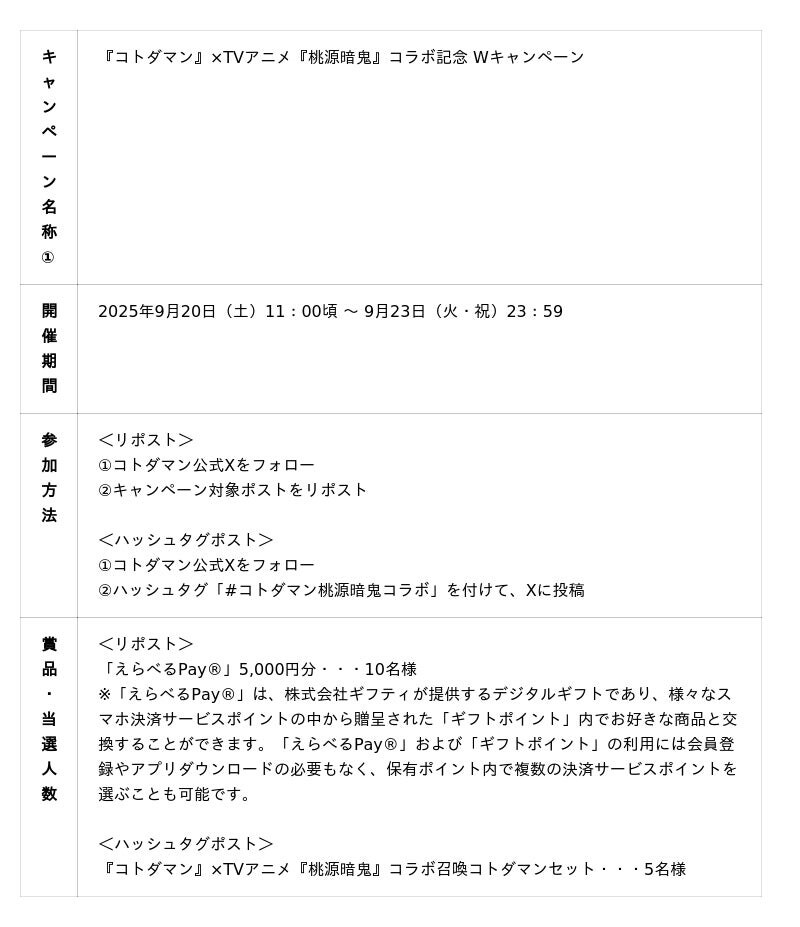 各種キャンペーンの応募規約・参加条件・賞品の詳細は、コトダマン公式お知らせをご確認ください。