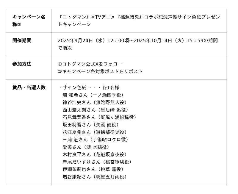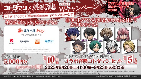 さらに、本日9月20日(土)よりコラボ記念スペシャルPVを公開します。そのほか、『コトダマン』×TVアニメ『桃源暗鬼』コラボ召喚コトダマンセットや「声優サイン色紙」が抽選で当たるXキャンペーンを開催します。