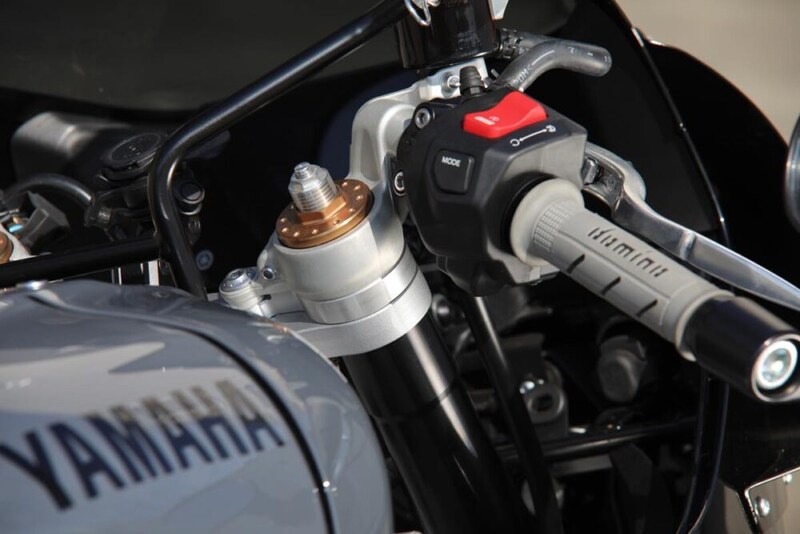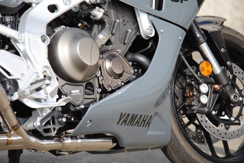 ノーマルはアンダーカウルがないけれど、ヤマハの純正アクセサリーを販売するワイズギアが一時期発売していたアンダーガードを装着して、レーシングマシンらしいルックスへと変貌を遂げた。