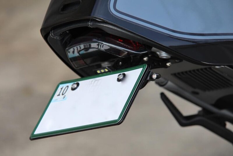 アンダーカウルとシングルシート、フェンダーレス処理が、より80年代のレーシングマシンらしさを強調する。そして、強いこだわりもって開発された3本出しのマフラーが圧倒的な存在感を見る者に与える。