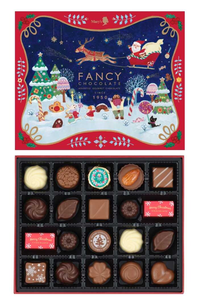 「クリスマスファンシーチョコレート(20個入 1,404円)」は、カカオクリームやミルクティーなど、ひと口で幸せが広がる多彩な味わい♡