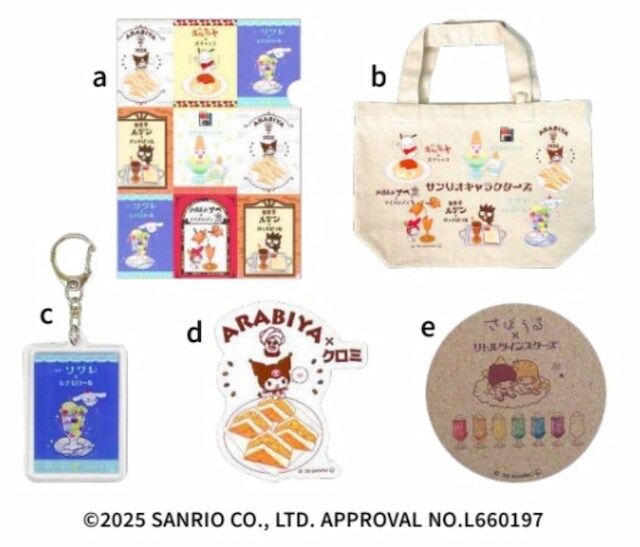 「あすなろ舎」の純喫茶×サンリオキャラクターズシリーズ第2弾(a)「A4クリアファルvol.2」(1枚/440円)、(b)「ランチトートバッグvol.2」(1個/1,870円)、(c)「アクリルキーホルダー」(1個/770円)、(d)「ステッカーS」(1枚/550円)、(e)「コースター」(1枚/880円)