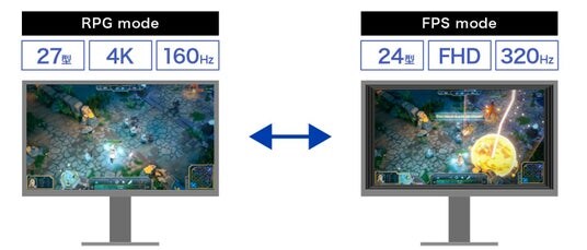 RPG・アクションゲームなどは、より臨場感を高める「4K」解像度で美しい映像を楽しみつつ、FPSゲームなどの動きの激しいゲームは、「320Hz」のハイリフレッシュレートでプレイするなど、2つのモードを切り替えてゲームを楽しむことができます。