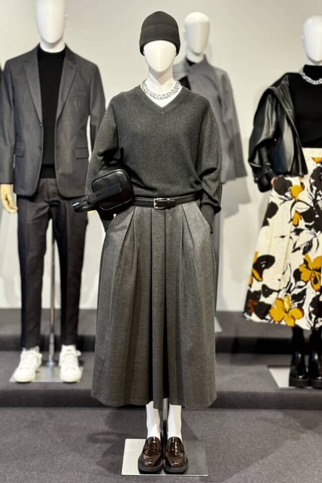▲ウールミックススムースVネックセーター ¥9,990、タックボリュームスカート ¥15,000 ※どちらも2025年10月下旬発売予定