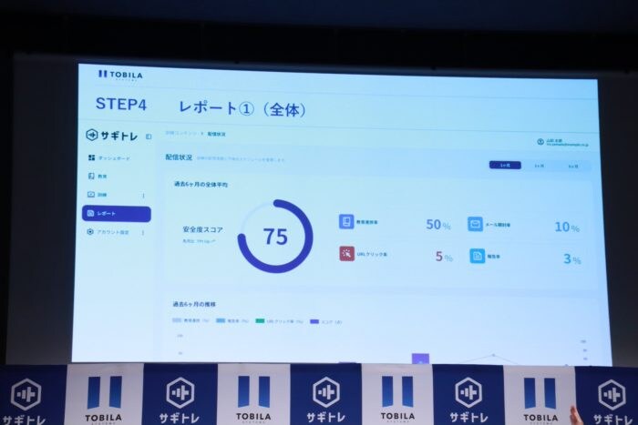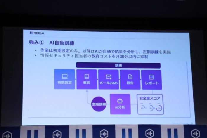 AIがその対応結果を分析し、個人・部門ごとのリスク傾向を可視化。分析結果に基づき、自動で最適な訓練内容や配信スケジュールを自動で設定してくれるサービスだと紹介しました。