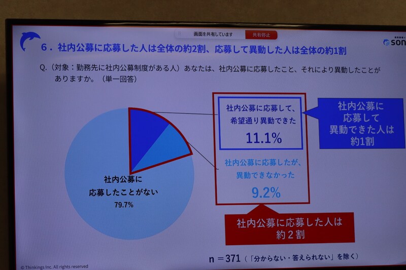 さらに調査では「社内公募制度がある」と答えた人が約40%に対し、実際に応募した人は約20%、そのうち希望通り異動できた人は約11%だという結果も出ている。