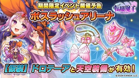 イベント「ボスラッシュアリーナ」を開催いたします 。今回のイベントでは、「【仮装】ドロテーア」が特効キャラクターとして活躍します。ランキング上位入賞者には、特別な称号や豪華報酬をご用意しております。 さらに「ボスラッシュアリーナ」と連動したミニミッションも同時開催!ミッションをクリアすることで、イベント限定装備「古代魔法シリーズ」などを獲得できます。是非この機会にイベントに参加してくださいね。