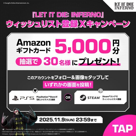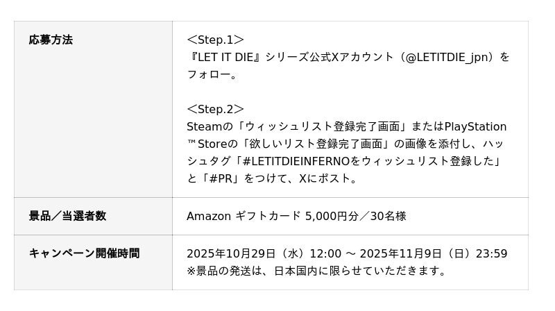 『LET IT DIE』シリーズ公式Xアカウントにて、抽選で30名様にAmazonギフトカード5,000円分が当たるキャンペーンを実施します。