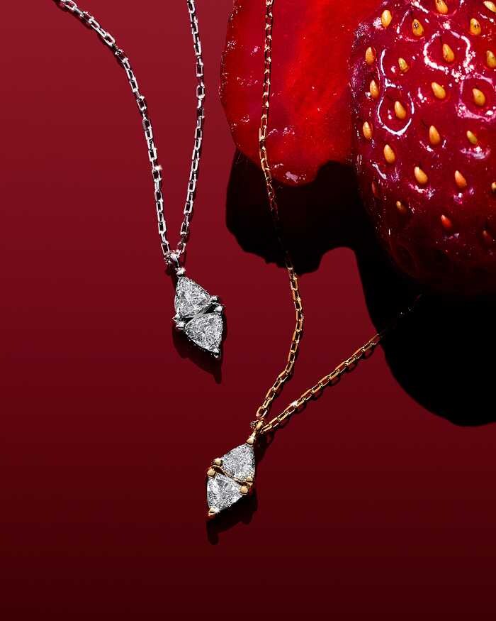今季注目は、トリリアントカットダイヤモンドを2石あしらったひし形フォルムが印象的な“セブロン ロサンジュ”シリーズ。