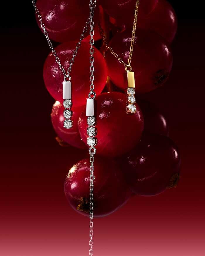 「ネックレス」(各74,800円/プラチナ・イエローゴールド)と「ブレスレット」(71,500円/プラチナ)を展開。