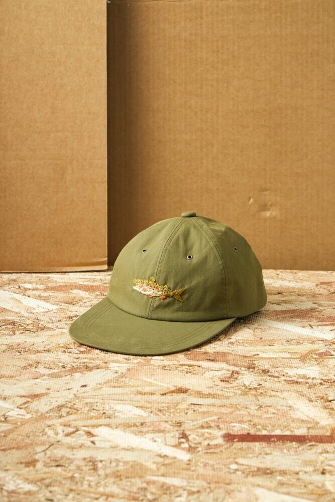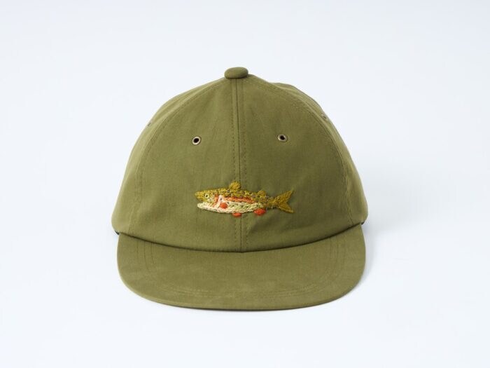 コットンナイロンのしなやかなボディに、熟練の職人による手刺繍で描かれたトラウト(鱒)がワンポイントとしてあしらわれており、アウトドアスタイルはもちろん、トラッドな装いの“はずし”としても映える万能アイテム。