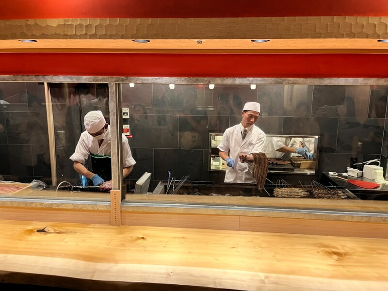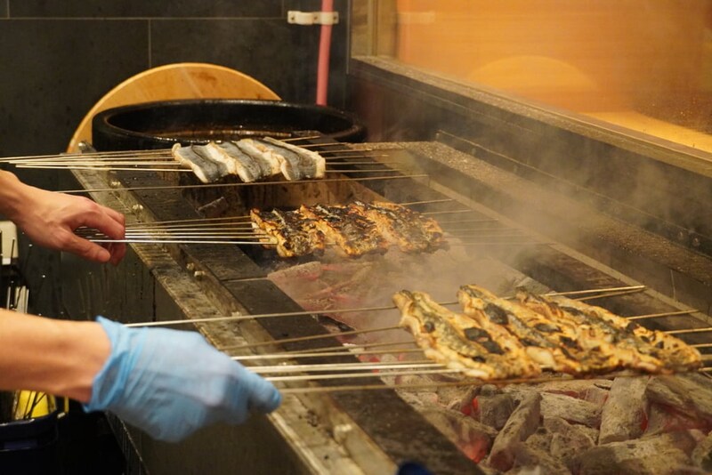 店内では、熟練の「焼き師」たちが捌きから焼き上げまでをライブで披露。カウンター席からはその一連の所作を眺めることができ、700℃の備長炭で香ばしく焼き上げる姿はまさに圧巻。