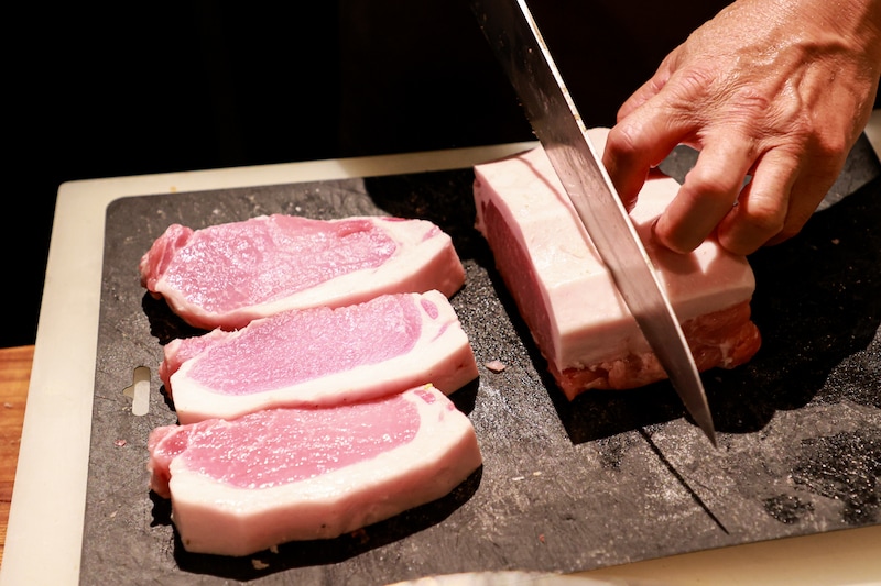 輸入豚肉はサシが1%から2%、一般の豚肉でも3%程度と言われているが、「常陸の輝き」はサシが4%程度入っている。きめ細やかにサシが入ることによって、柔らかくて旨味があって香りのいい肉質が実現されている。