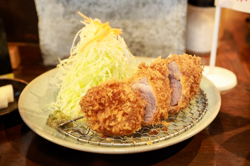 店主においしい食べ方を聞くと、まずは肉の旨味を感じるために塩やソースをつけずに食べてください、と返答があった。その通り、食べてみると、ロースもヒレもなにもつけずとも思っていたよりもしっかりと肉の味を感じることができ、ご飯が進むほどの食べ応えを感じた。