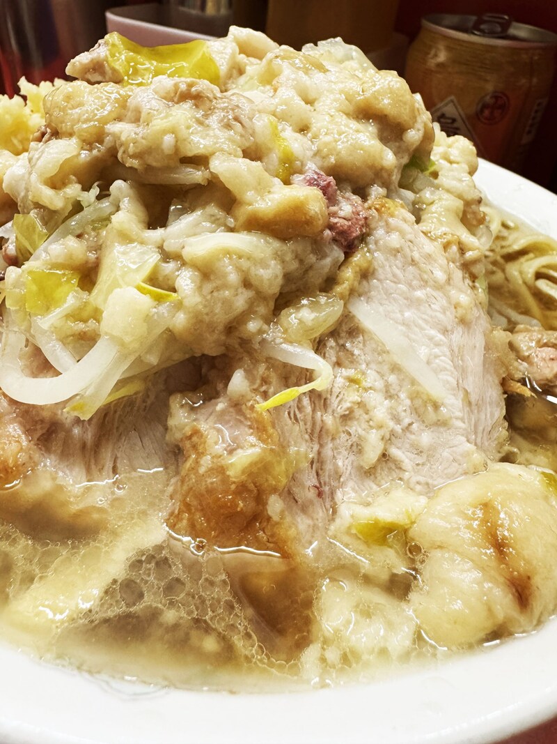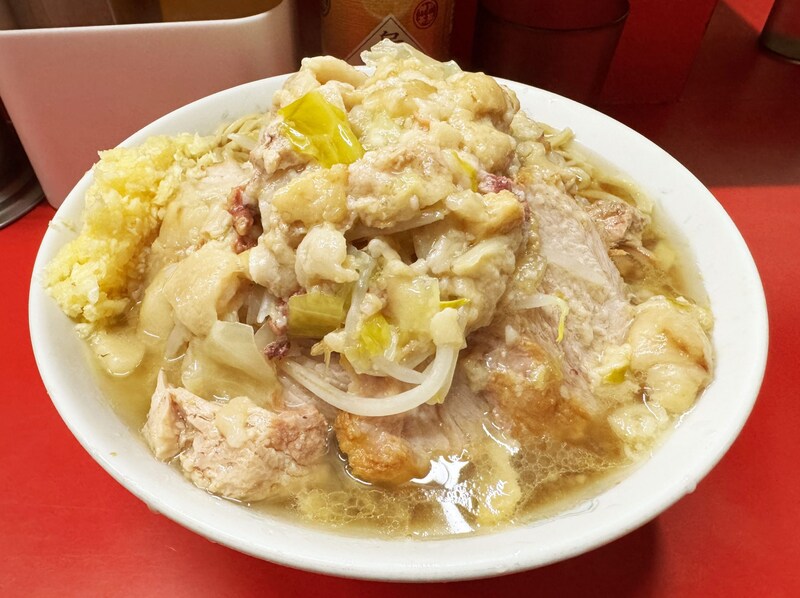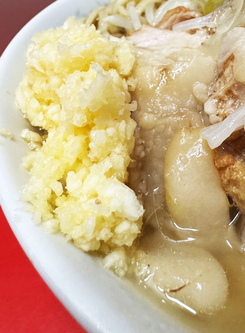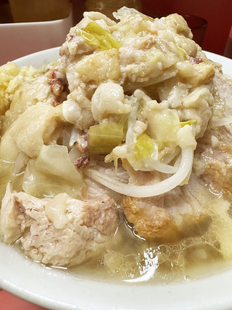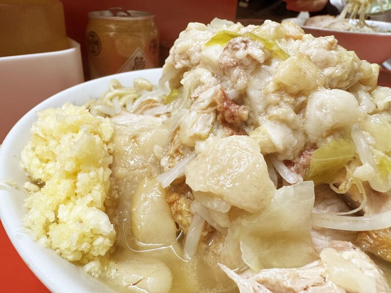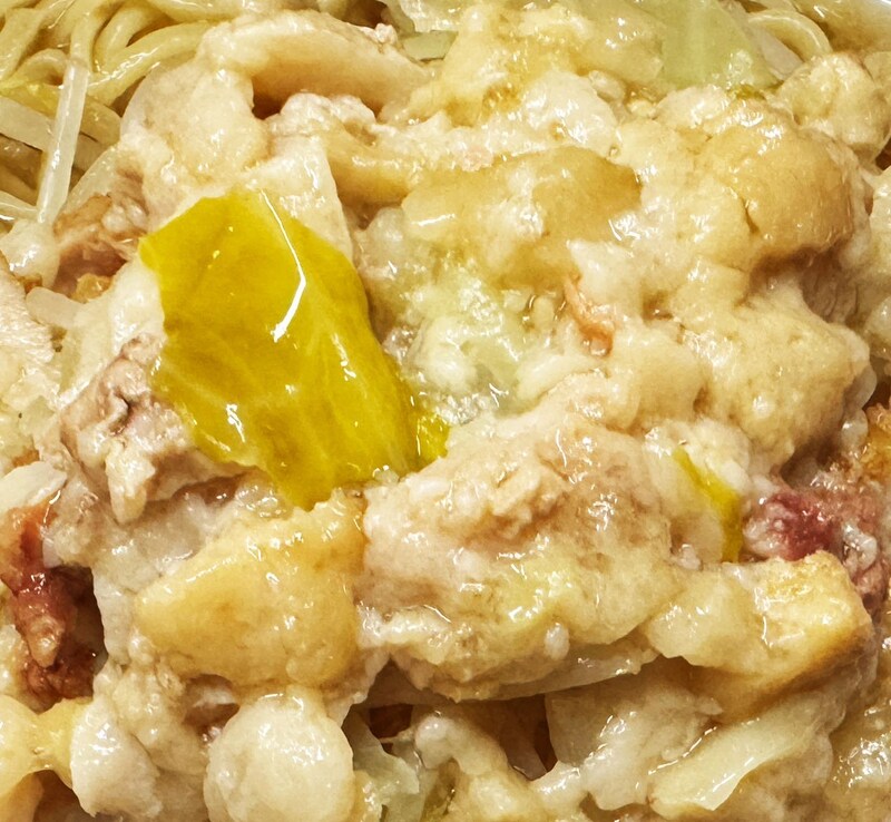 まず、アブラに着目してほしい。トゥルントゥルンのジェリー状アブラがヤサイの隙間から浸透。それを食べれば、ピュアな「ヤサイの甘味」と「アブラの甘味」のダブルスウィートが堪能できる。さらにアブラ由来のコクも素晴らしく、この時点で、スープと合流していなくとも「ヤサイとアブラだけでラーメン二郎の良さを物語っている」といえるのだ。