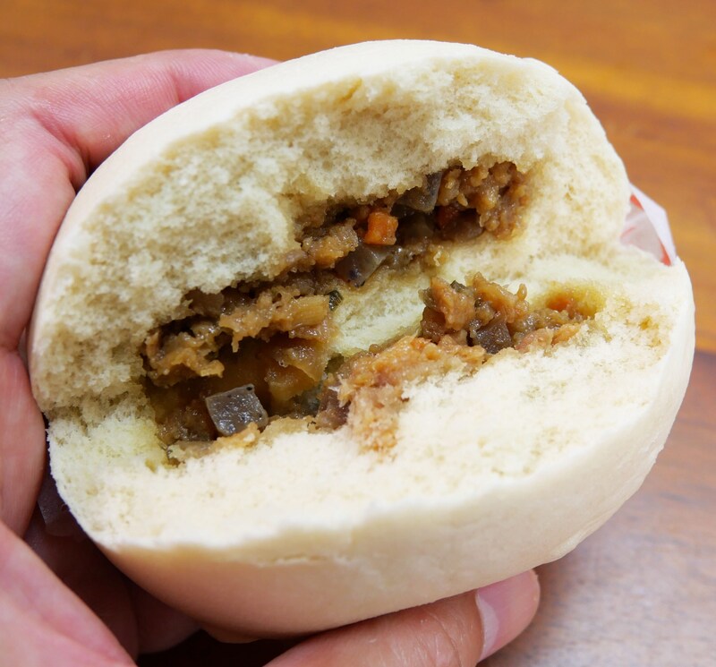 ファミリーマートの「けんちんまん」は、大きすぎず、小さすぎず、おやつしとて、間食として、メインディッシュに添えるフードとしてベストなサイズ。半分に割ってみると、茶褐色のソースをたっぷりと纏った豚肉や野菜がどっさり。目視ではルーローファンのルーローのようにも見える。