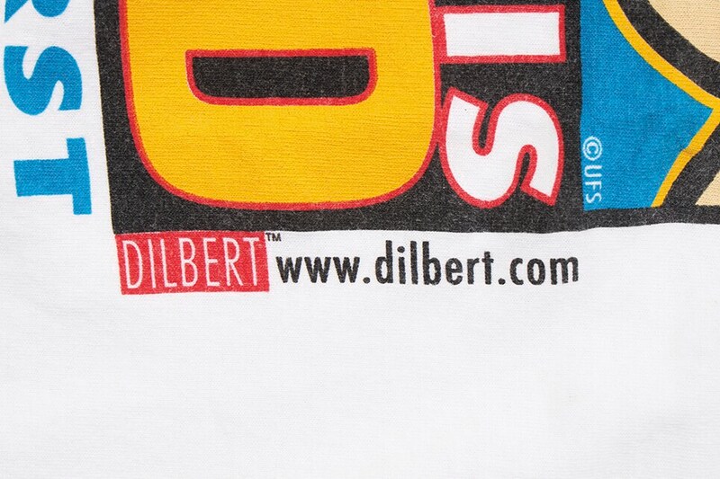 1989年から新聞掲載されたコマ割り漫画。作者「スコット・アダムス」によるディルバートというエンジニアを主人公にした企業が舞台の職場文化を風刺した作品。Tシャツでは1コマと文字で表現されている。気の抜けたタッチと明るい色使いを裏腹に鋭いところを突いてくる目線と考え方が光る。デザインだけで選びがちなTシャツだがコチラは漫画の内容も込みで選ぶと良いだろう。