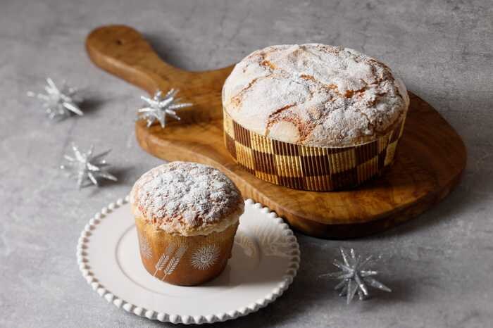イタリアの「パネトーネ」はバター香る生地にドライフルーツを加え、ふんわり軽い食感で世代を問わず楽しめます(大¥1,200、小¥300)。