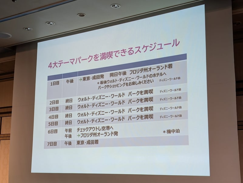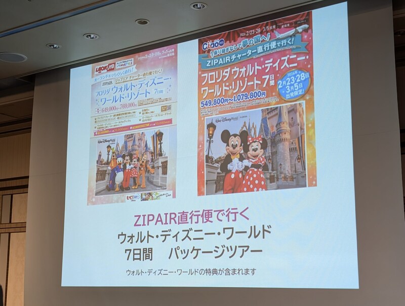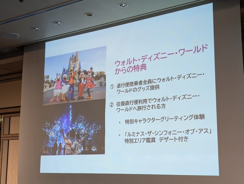発表会では本チャーター便の運航に合わせて、ディズニー・ディスティネーション・インターナショナルとの共同プロモーションも発表に。フロリダ州オーランドにはフロリダ ウォルト・ディズニー・ワールド・リゾートがあり、旅行代理店によるパッケージツアーの販売も発表されました。