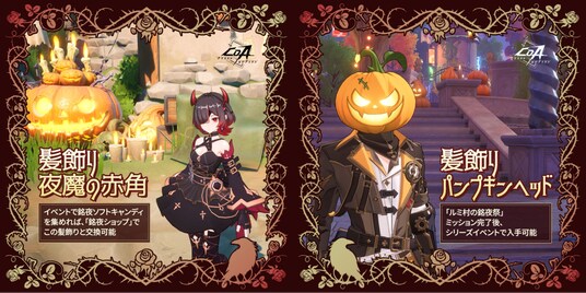 銘夜祭の期間中、ハロウィン限定イベント「ゴールデン・ナイト」に参加し条件をクリアすると、限定髪飾り「夜魔の赤角」や限定髪飾り「パンプキンヘッド」などハロウィンテーマの可愛いアイテムが手に入ります。また、限定実績「キミこそパンプキンの王様だ!」なども獲得できます。
