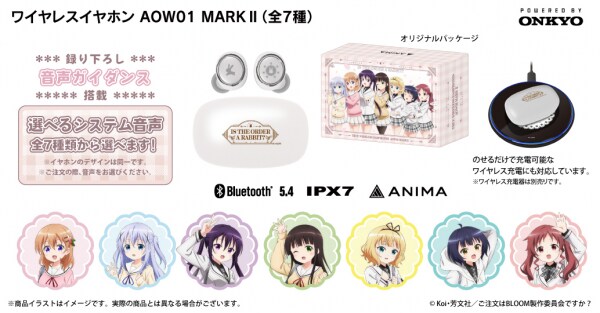 本コラボレーションモデルは作品タイトルを充電ケースに、作品モチーフを左右ハウジングプレートに配置。新規録り下ろし音声ガイダンスは「ココア」「チノ」「リゼ」「千夜」「シャロ」「マヤ」「メグ」の中から1つ選択可能で、お選び頂いた音声ガイダンスを搭載しお届け致します。電源オンやオフ、ペアリング時やタップ音等、それぞれ計11ワードのボイスを楽しめます。イヤホンお届け時期に専用アプリ「ANIMA Studio」にて7キャラクターそれぞれの音声ガイダンスのDL販売を予定しております。TVアニメ 『ご注文はうさぎですか?』ワイヤレスイヤホンご購入者のみDL購入が可能で、初期搭載ボイス(購入モデルのボイス)に加え、DL購入ボイスも楽しめる仕様となっております。パッケージは描き下ろしイラストデザインとなっております。