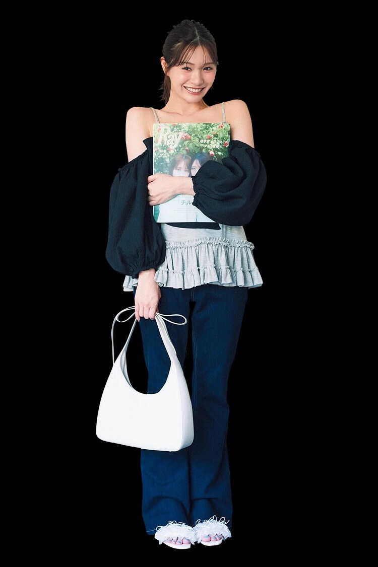 大きめリボンが可愛い今っぽトップスを重ねて女のコ気分全開♡ デニムパンツでカジュアル成分も忘れない。