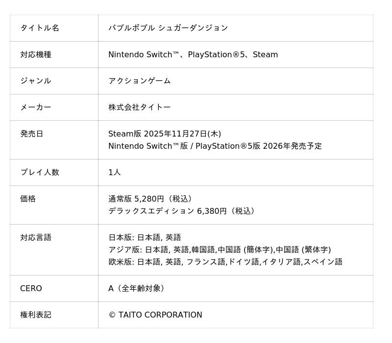 株式会社タイトー(本社:東京都新宿区、以下タイトー)は、アクションゲーム『バブルボブル シュガーダンジョン』Steam版の発売予定日である11月27日(木)に先立ち、本日より予約受付を開始しました。デジタルサウンドトラックやデジタルアートブックとセットになった、デラックスエディションの発売も決定し、こちらも本日より予約を開始します。