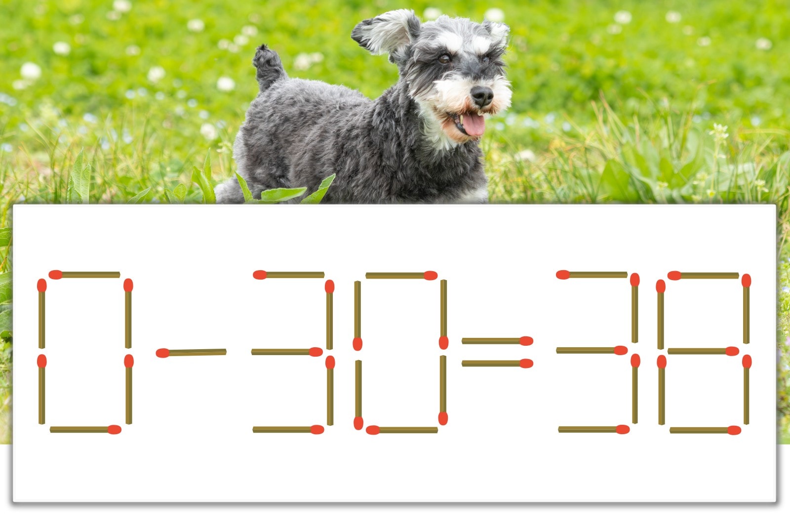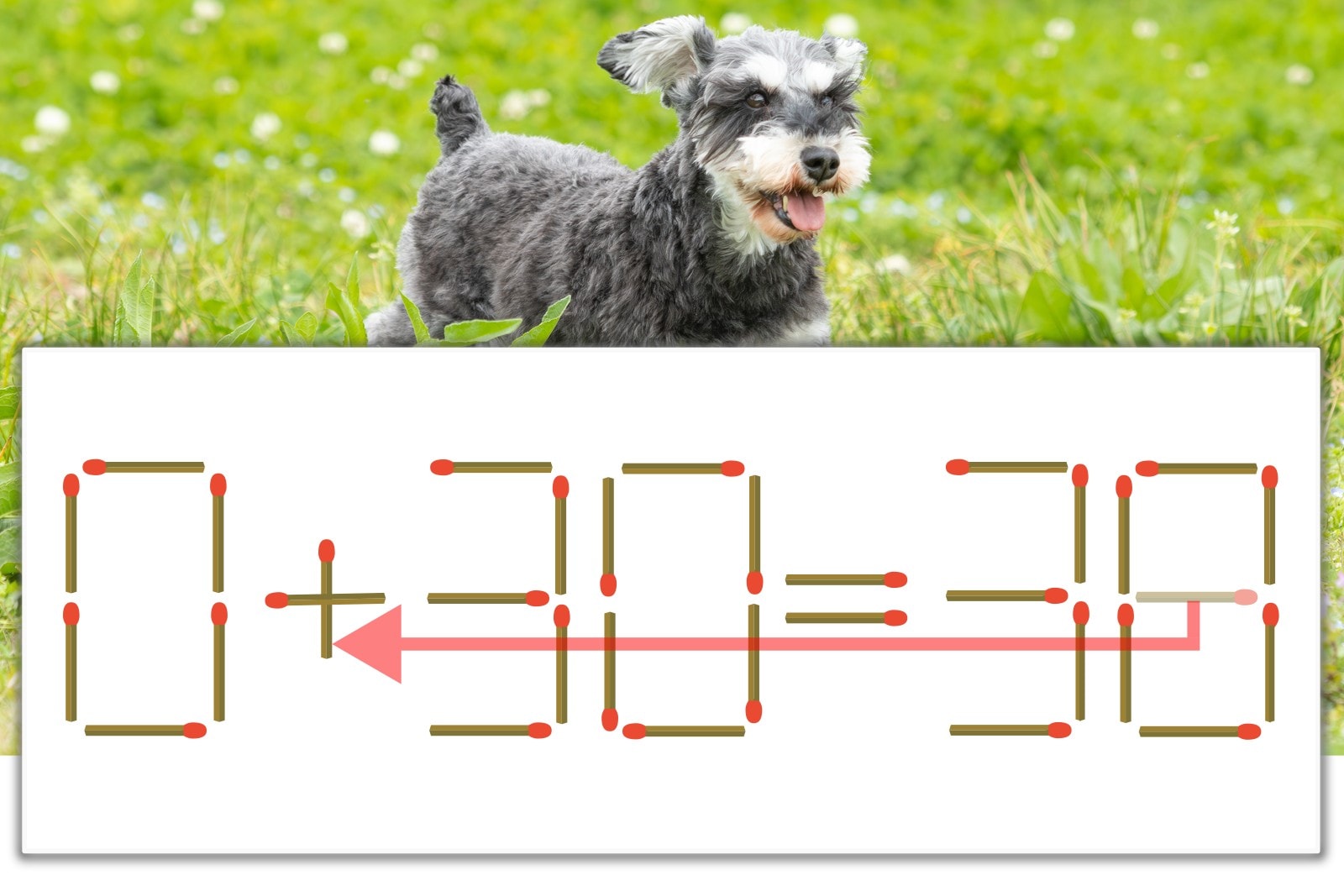 「8」を別の数字に変化させると答えが導き出せます。「8」のマッチ棒を1本移動して、「-」を「+」にしてみましょう。すると、「0+30=30」が成立します。