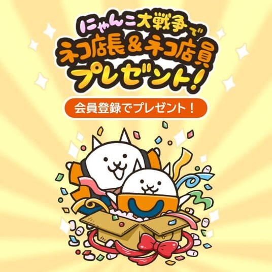 にゃんこ大商店オンラインに会員登録すると、スマホアプリ『にゃんこ大戦争』で、限定キャラクター「ネコ店長&ネコ店員」をプレゼントいたします。