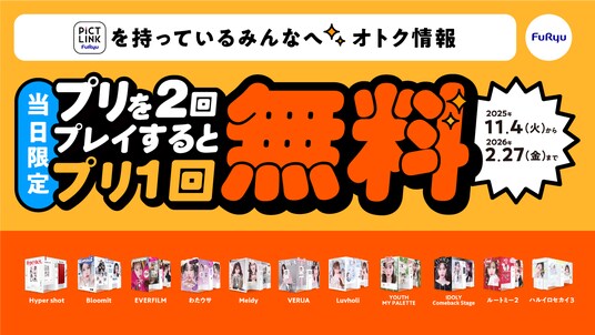 フリュー株式会社(本社:東京都渋谷区、代表取締役社長:榎本雅仁、以下フリュー)は、全国のアミューズメント施設に設置する対象のプリントシール(以下 プリ)機にて『当日3回目お得サービス』を11月4日(火)から2026年2月27日(金)の期間限定で実施いたします。