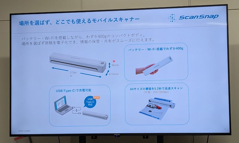 前モデル「ScanSnap iX100」同様、バッテリーとWi-Fi機能を搭載しながら本体が400gと軽量で、外出先でも手軽にスキャンできるモバイルスキャナー。ix100がmicro-B TypeだったUSBポートがUSB Type-Cポートに変更され、USB-Cケーブルで充電が可能になりました。