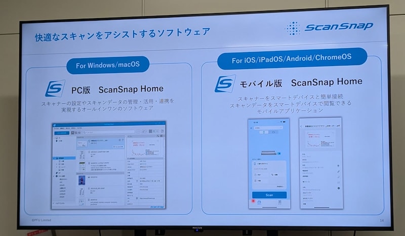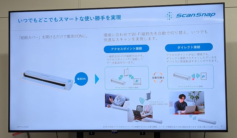 給紙カバーを開けると電源がONになり、アクセスポイント経由でWi-Fiに接続したり、デバイスへダイレクトにワイヤレス接続が可能。スキャンしたデータは専用ソフト「ScanSnap Home」で管理でき、データの確認や保存先の設定、各種クラウドサービスへデータを送信できる「ScanSnap Cloud」との連携が可能になります。