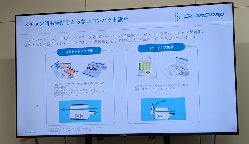 用紙のフィードは本体の手前から奥へ送るストレートパスと、排出ガイドを開けて手前に用紙が戻るUターンパスの2通りの方法があり、限られたスペースで場所をとらずにスキャンが可能。レシートや名刺など小さな原稿は2枚並べて同時にスキャンできるデュアルスキャンに対応する他、プラスチックカードの読み取りにも対応します。