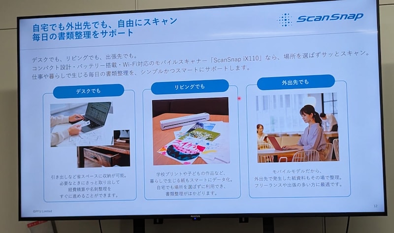 PFUは10月30日、ワンタッチでスピーディーに書類を電子化するイメージスキャナー「ScanSnap」シリーズの新モデル「ScanSnap iX110」を発表。11月13日に販売開始します。価格はオープンで、直販サイト「PFUダイレクト」での販売価格は2万7500円(税込)。