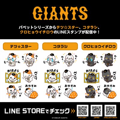 その記念すべきキャラ別ver.LINEスタンプの第10弾は、内海哲也コーチの「テツ☆スター」と、中川皓太選手の「コタラシ」、立岡宗一郎コーチの「クロヒョウイチロウ」の3点の同時の配信となり、今回も株式会社インクルーズが描き起こした特別なデザインとなっております。