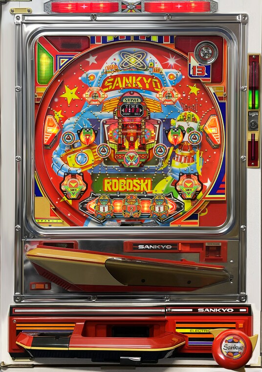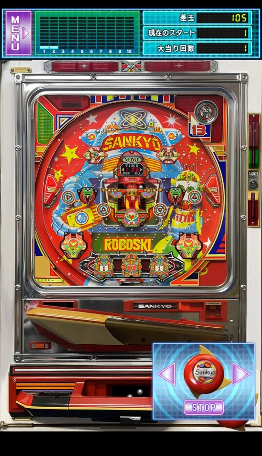 役物内にはスキーをはいたロボット・ロボスキーが立っていて、通常時は羽根から拾われた玉がダイレクトあるいは足下にうまく跳ね返って、V入賞すれば大当りとなる。