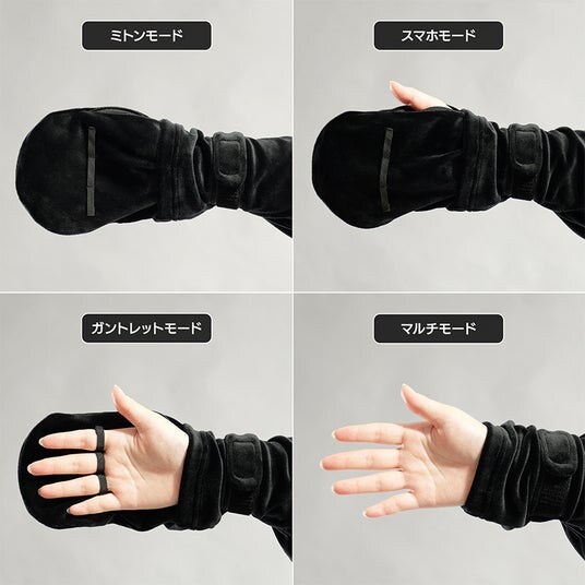 過去発売のダメ着で大変ご好評いただいた、指先の露出度合いを4段階で調節できる独自の手袋システムを継承しました。スマホ操作に用いる親指のみ露出する「スマホモード」、キーボード/マウス操作時はミトンを手の甲に固定して冷気から守る「ガントレットモード」など、使用するデバイスや室温に合わせて、最適なモードへ瞬時に切り替えることが可能です。