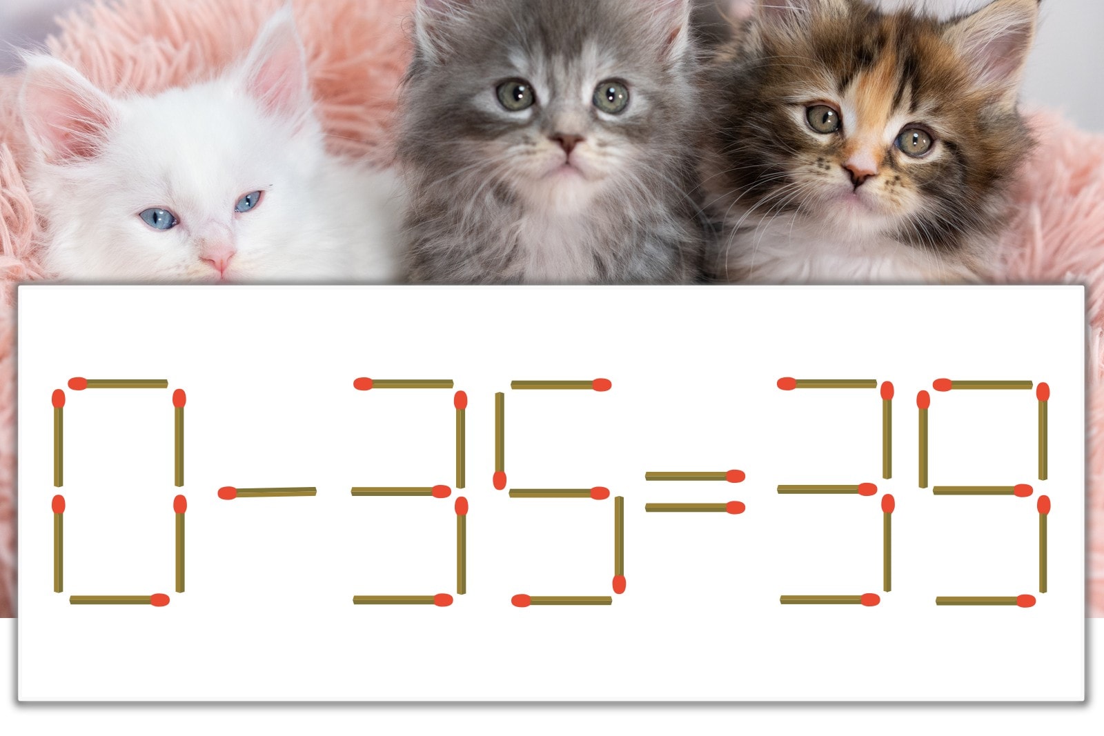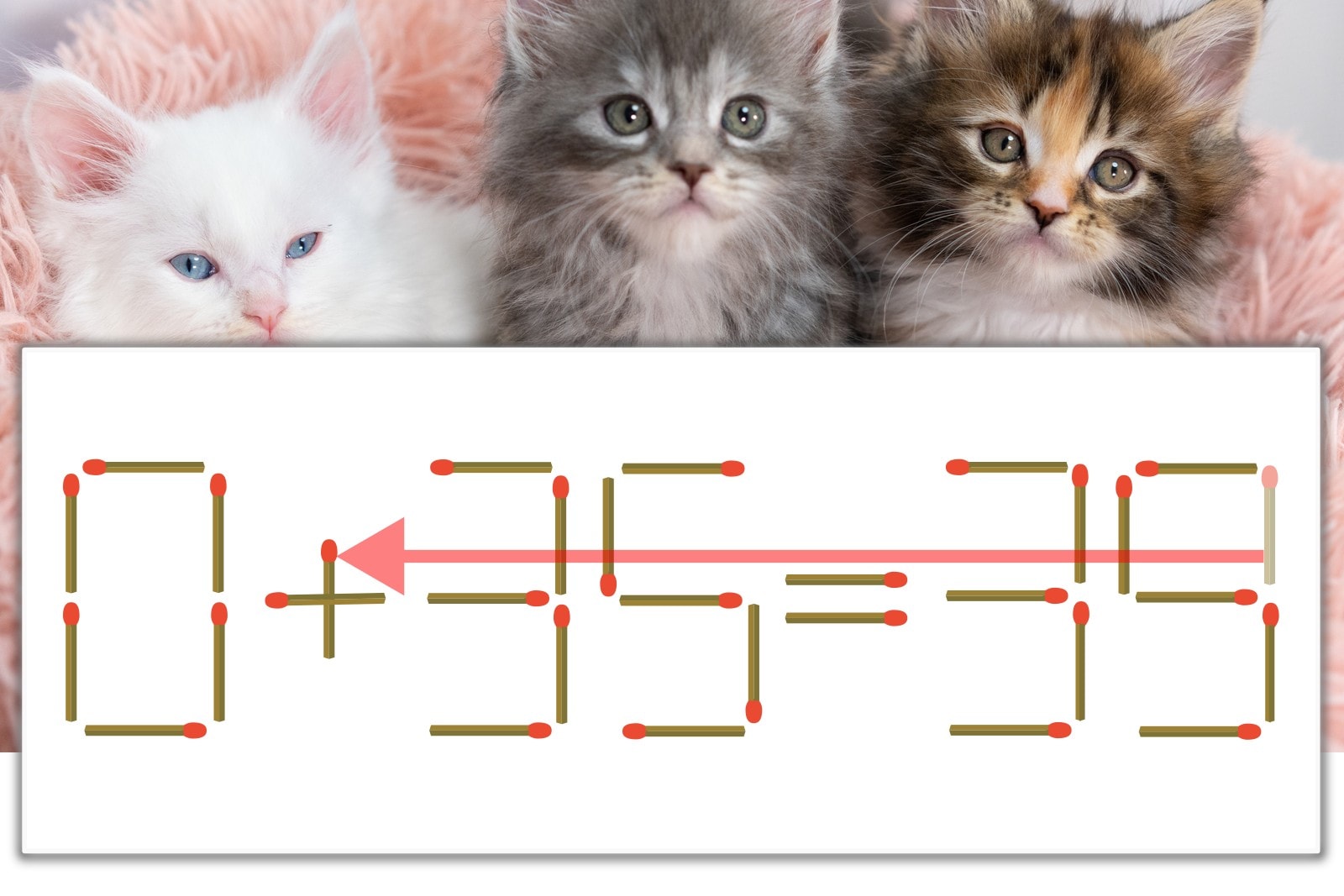 「9」を別の数字に変化させると答えが導き出せます。「9」のマッチ棒を1本移動して、「-」を「+」にしてみましょう。すると、「0+35=35」が成立します。